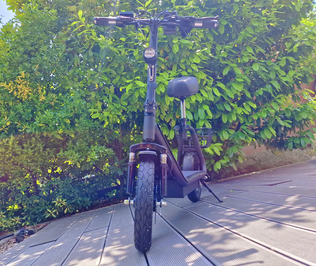 Sammanfattningsvis är denna elsparkcykel en utmärkt kombination av prestanda och komfort. Med dess integrerade sadel, bakre korg, 12 tums luftdäck och främre stötdämpare, kan du njuta av en bekväm och säker körupplevelse varje gång du använder den.